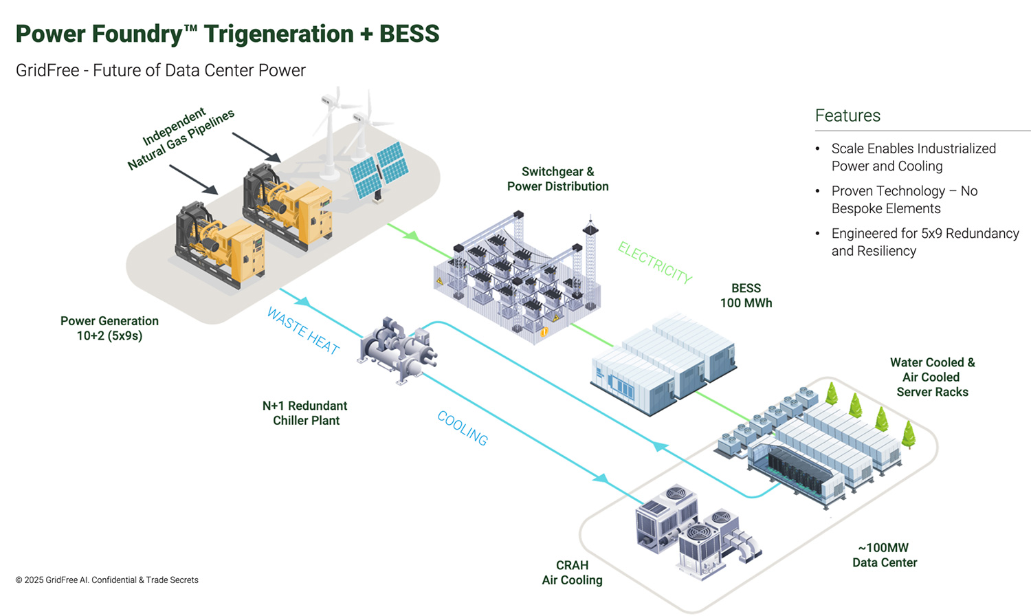 According to GridFree AI, the core platform behind the development is the Power Foundry, a self-contained, on-demand power and cooling system. GridFree AI says it operates independent of local electrical grids; can be delivered in less than 24 months from lease signing; leverages American-produced natural gas to reduce exposure to grid congestion, curtailment, and price volatility; delivers 5×9 availability (99.999%); and provides industrial-grade chilled-water cooling for modern compute.