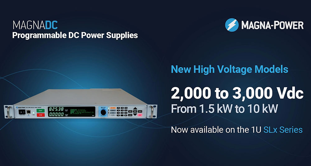 Magna-Power Electronics has expanded its SLx Series programmable DC power supplies with new high-voltage 1U models rated at 2000 Vdc, 2500 Vdc, and 3000 Vdc. The company says the new units deliver up to 3000 Vdc and 10 kW in a standard 1U rack-mount enclosure (1.75″ x 19″ x 24″) with fully floating outputs.